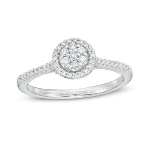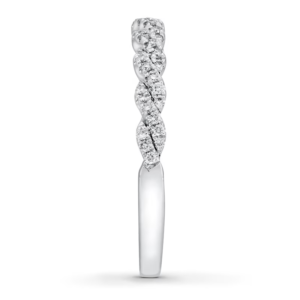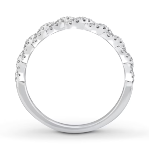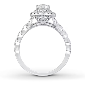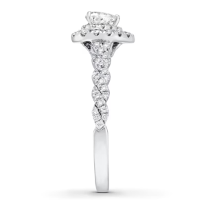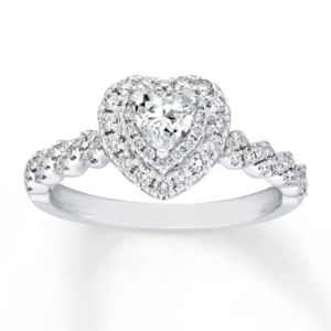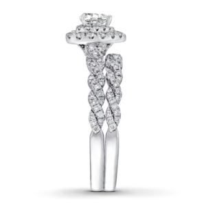 A gorgeous symbol of your love, this sparkling bridal; features an engagement ring with a romantic heart-shaped diamond haloed by glimmering round diamonds. The band and matching wedding ring are adorned with twists of round diamonds, bringing the total weight of the set to 7/8 carat. The ring is styled in 14K white gold.