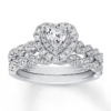 A gorgeous symbol of your love, this sparkling bridal; features an engagement ring with a romantic heart-shaped diamond haloed by glimmering round diamonds. The band and matching wedding ring are adorned with twists of round diamonds, bringing the total weight of the set to 7/8 carat. The ring is styled in 14K white gold.