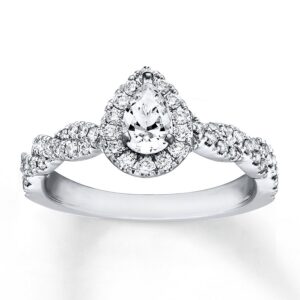 This glamorous engagement ring showcases a pear-shaped diamond, framed in round diamonds. Ribbons of round diamonds adorn the 14K white gold band for a total diamond weight of 3/4 carat.